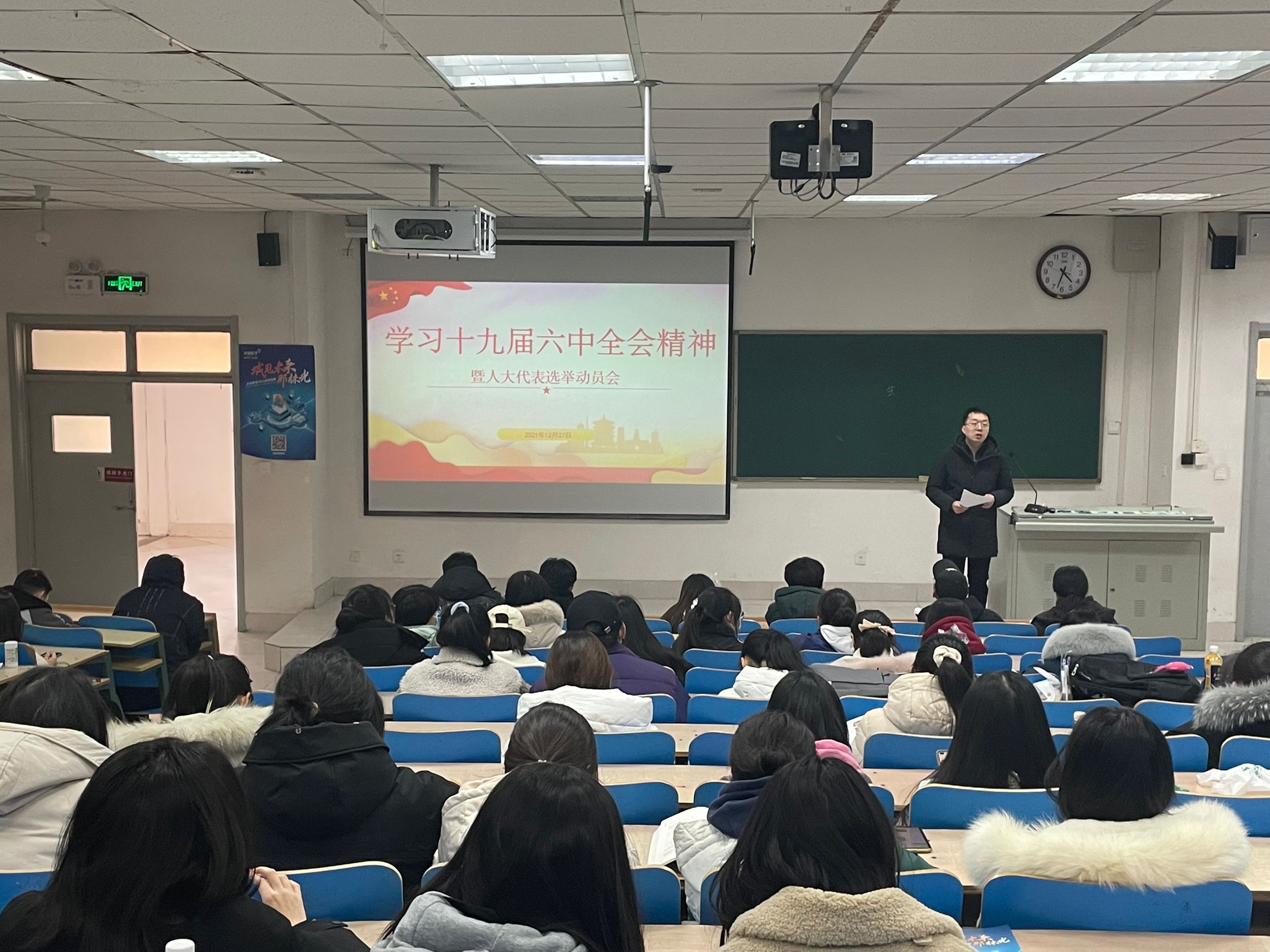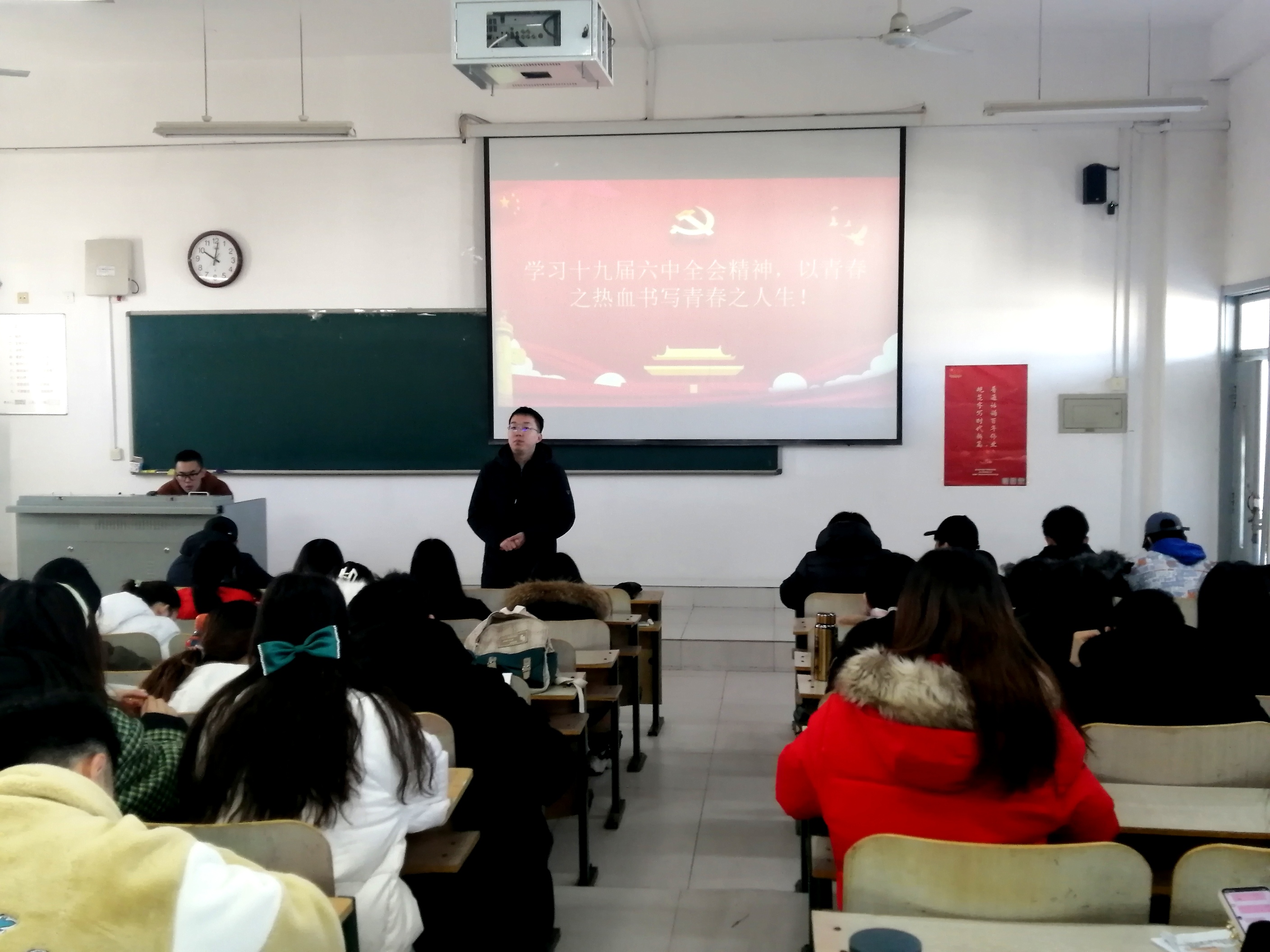 宣讲介绍了全会召开的基本情况,就全会通过的《中共中央关于党的百年奋斗重大成就和历史经验的决议》及习近平总书记在党的十九届六中全会上的重要讲话精神进行详细解读。会上,辅导员集中领学了全会提出的两个“确立”、三个“需要”、四个“必须”,深入学习了中国共产党百年奋斗的五大“历史意义”和党长期实践积累的十个“坚持”。激励广大同学全面贯彻习近平新时代中国特色社会主义思想,大力弘扬伟大建党精神,以史为鉴、开创未来。