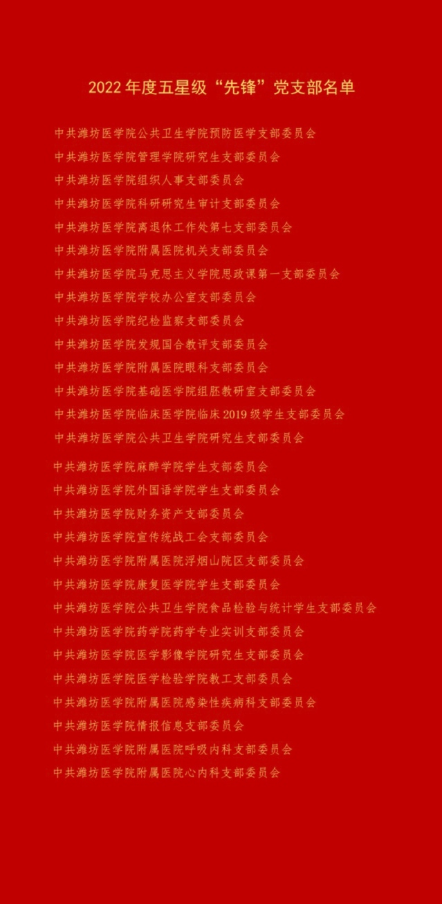 日前,中共潍坊市委教育工委印发《关于命名五星级“先锋”党支部的通报》,经党支部自评、基层党委考评和市委教育工委复核,决定命名153个党支部为2022年度五星级“先锋”党支部,威廉希尔官网预防医学党支部位列其中。